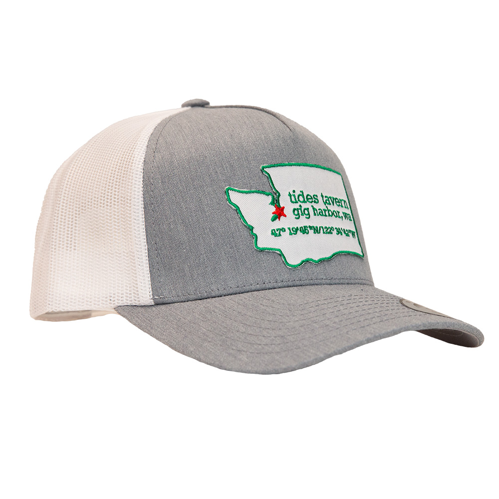 A patch of our home state of Washington is featured on this classic trucker hat. It’s marked with our location tucked away in beautiful Puget Sound. Truly Pacific Northwest! Charcoal and black hat with a white, red and green patch on the front.